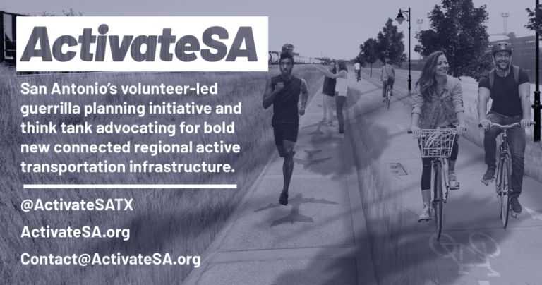 ActivateSA is a tactical planning initiative and think-tank composed of architects, landscape architects, conservationists, civil engineers, civic leaders, transportation planners, and others working collectively to implement bold new active transportation infrastructure through advocacy, consensus-building, and technical design. Learn more at https://activatesa.org/.